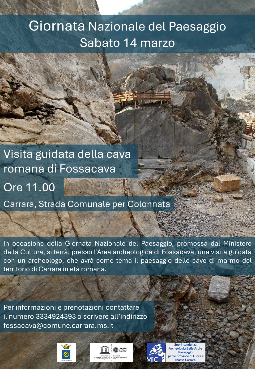 presso l’Area archeologica di Fossacava, si terrà una visita guidata organizzata dal funzionario archeologo Giulia Picchi sul tema del paesaggio delle cave di marmo del territorio in età romana; (per informazioni e prenotazioni si prega di contattare il 333/4924393 o di scrivere al seguente indirizzo mail: fossacava@comune.carrara.ms.it);