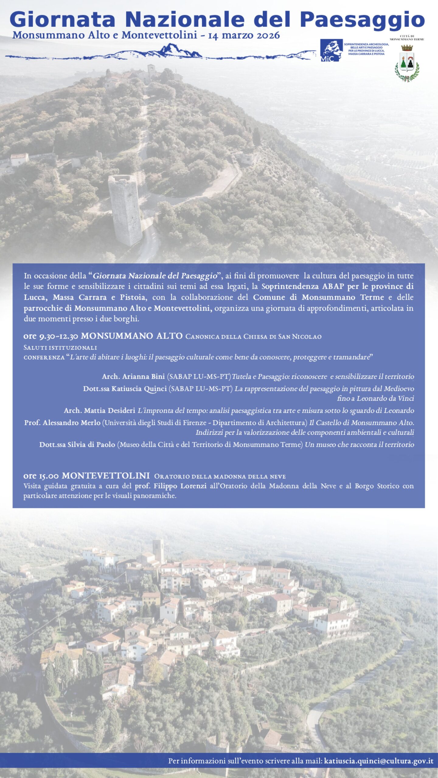 Dalle 9:30 alle ore 12:30 presso la Canonica della Chiesa di San Nicolao si svolgerà la conferenza sul tema: L’arte di abitare i luoghi: il paesaggio culturale come bene da conoscere, proteggere e tramandare organizzata dal funzionario architetto Arianna Bini e dal funzionario storico dell’arte Katiuscia Quinci coadiuvati da specialisti del settore. Alle 15:00 visita guidata gratuita dell’oratorio della Madonna della Neve e per le vie del borgo di Montevettolini (per informazioni scrivere a katiuscia.quinci@cultura.gov.it)